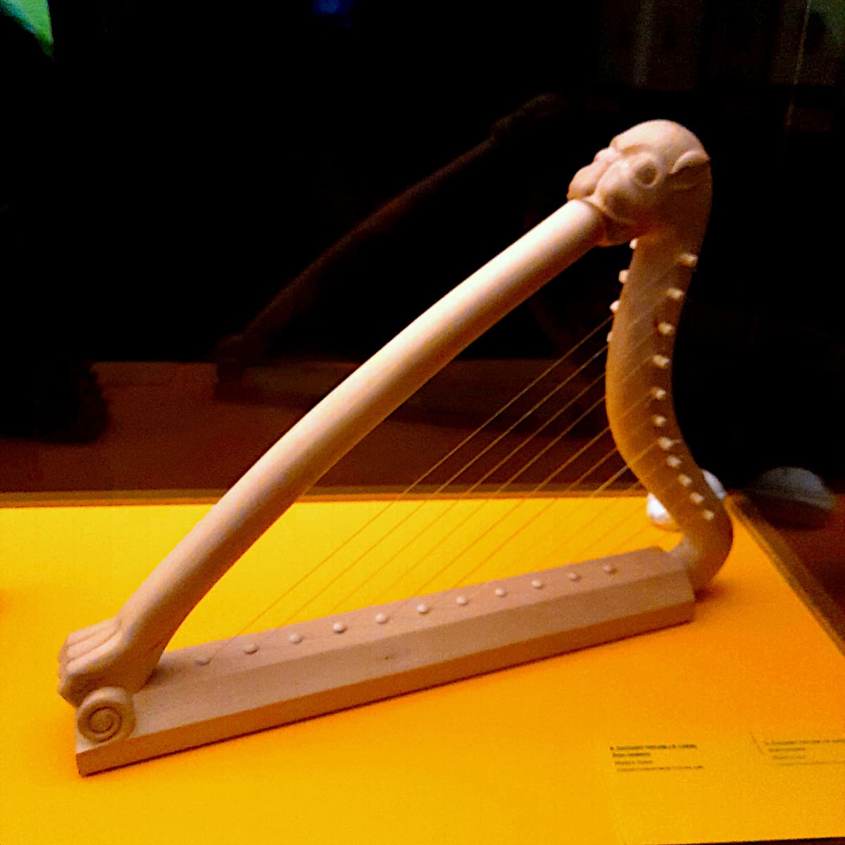 El arpa es uno de los instrumentos más antiguos y emblemáticos, y su presencia en el Pórtico simboliza la conexión con las tradiciones musicales y poéticas. Se caracteriza por su marco triangular y sus cuerdas de longitud variada, que se pulsan para producir una melodía celestial. El arpa de la "Orquesta de Piedra" demuestra su papel central en la música cortesana y religiosa de la época.